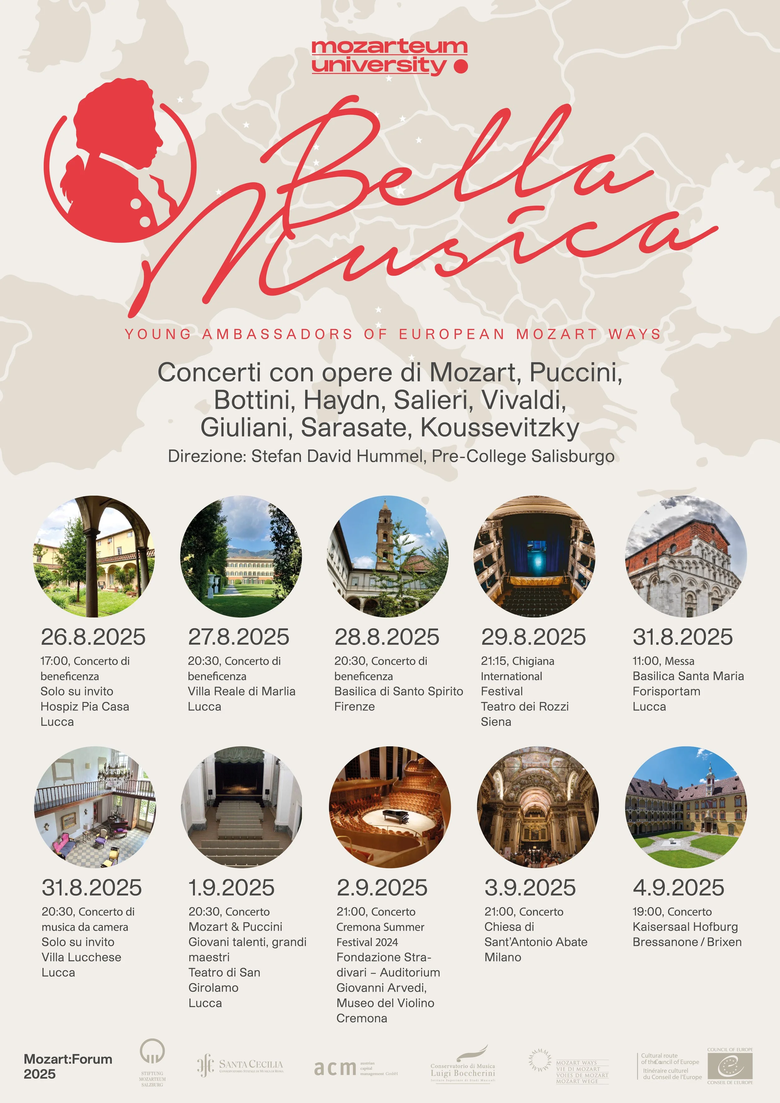 Unsere musikalische Reise 2025 führt uns in die bezaubernde Stadt Lucca, die Geburtsstadt Giacomo Puccinis. Den Auftakt bildet ein Probenaufenthalt in der historischen Villa Principessa, wo Inspiration auf Geschichte trifft. Ein Höhepunkt wird die neue künstlerische Zusammenarbeit mit dem Teatro del Giglio „Giacomo Puccini“ und dem Conservatorio „Luigi Boccherini“ sein – eine Hommage an die musikalischen Traditionen von Lucca und Salzburg mit ihren großen Komponisten Puccini und Mozart.
