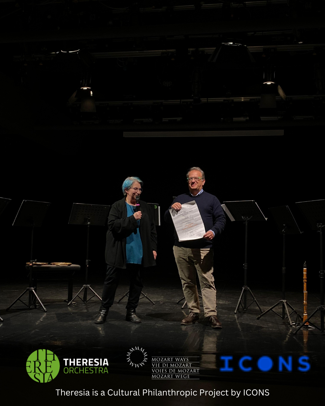 Während des “Theresia Winds” Konzerts in Turin überreichte Angela Romagnoli, Vorstandsmitglied der Europäischen Mozart Wege, die Urkunde offiziell an Mario Martinoli, den künstlerischen Leiter des Theresia Orchestras und Gründer und Mitvorsitzenden von ICONS.