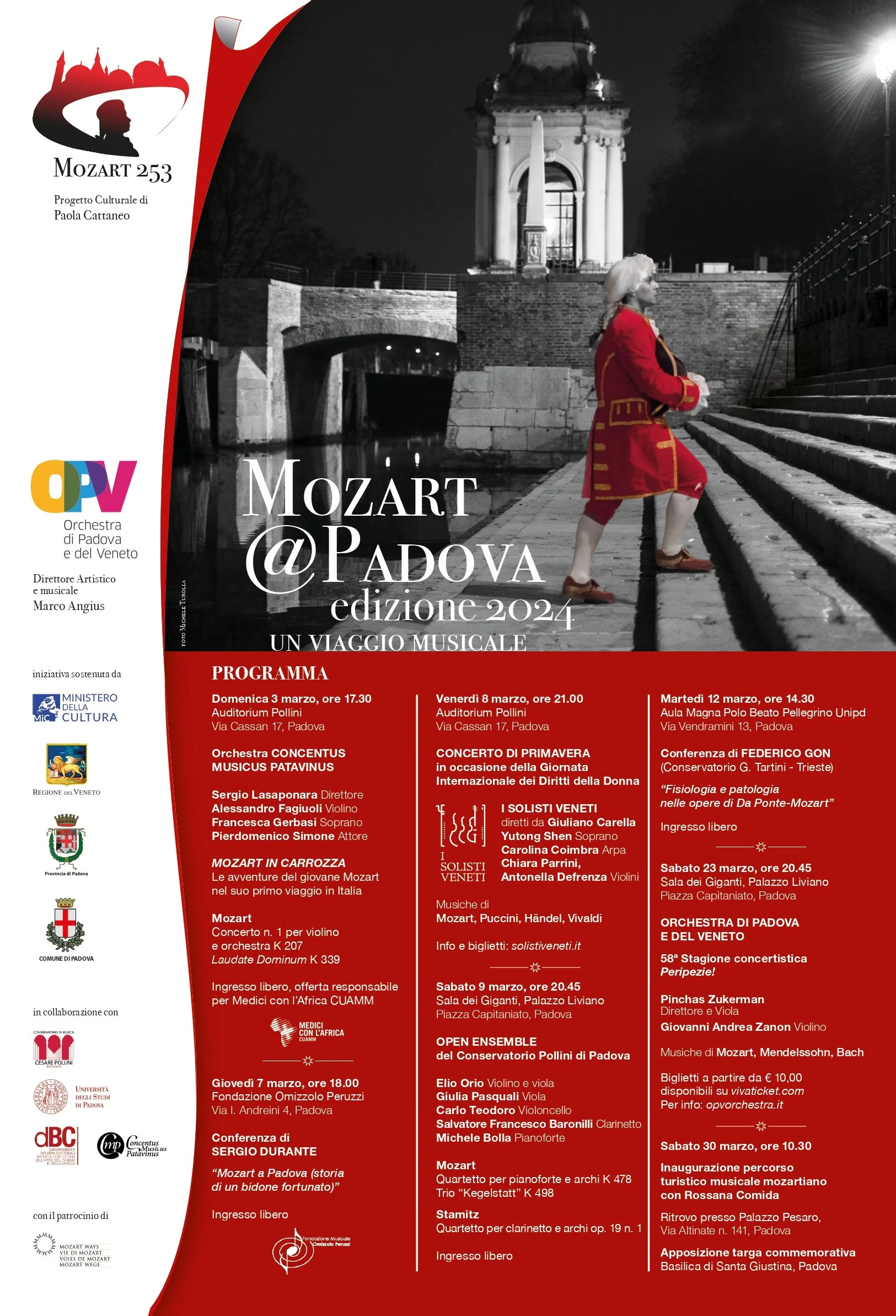 Vom 3. – 30 März finden eine Reihe von Konzerten und Symposien statt. Am 30. März wird die dritte Gedenktafel zu Mozarts Aufenthalt an der Basilika di Santa Giustina enthüllt. In der Basilika hat Wolfgang während des Aufenthalts die Orgel gespielt. Neben dem „Orchestra di Padova e del Veneto“ unter dem Dirigat von Pinchas Zukerman werden die Konzerte vom „Orchestra CONCENTUS MUSICUS PATAVINUS“, den „I SOLISTI VENETI“ unter der Leitung von Giuliano Carella sowie dem „OPEN ENSEMBLE - Conservatorio Pollini di Padova“ gestaltet. In den beiden Symposien beschäftigt sich Sergio Durante mit dem Aufenthalt von Mozart in Padova und Federico Gon mit Physiologie und Pathologie in den Werken von Da Ponte-Mozart". Die Veranstaltung findet unter der Schirmherrschaft der Europäischen Mozart Wege statt.